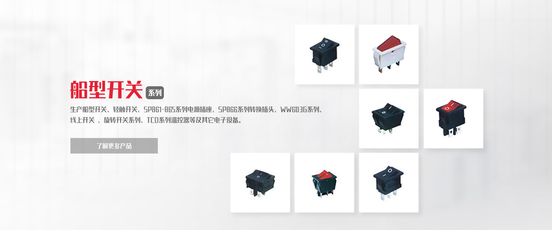 公司專業(yè)生產(chǎn)船型開關、輕觸開關、SP861-865系列電源插座、SP866系列轉(zhuǎn)換插頭、WW11系列微動開關、WW01-03、09系列按鈕開關DS、WW系列指示燈開關、WW603G系列 線上開關 、旋轉(zhuǎn)開關系列、TCD系列溫控器等及其它電子設備。